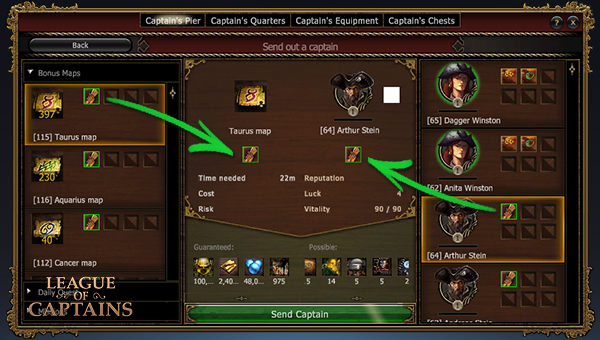 Когда у тебя есть подходящий для работы капитан, ты можешь отправить его на задание. Выполнение задания займёт определённое время. Когда капитан вернётся, ты сможешь забрать награды.