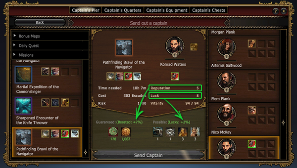 Каждая способность повышает шанс найти возможную добычу, если капитан обладает подходящей для поручения способностью.