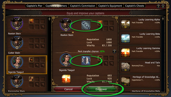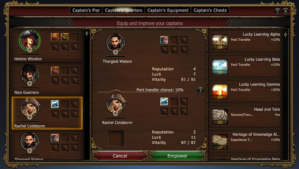 С помощью развития можно передать капитану опыт, но придётся принести в жертву другого капитана. При этом есть шанс передать и способность.