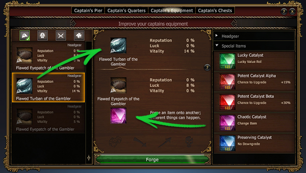 Для ковки войди в раздел снаряжения капитана. Выбери предмет для создания (левый список) и добавь другой предмет в качестве материала (правый список). Типы предметов должны совпадать.