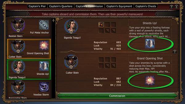 Капитанов много, и обычно они отличаются друг от друга. Нанимаемые капитаны с одинаковой фамилией (и портретом) получают набор начальных характеристик и могут обладать способностью. Не каждый капитан может обладать той или иной способностью (но способности можно передавать от одного капитана другому с помощью развития).